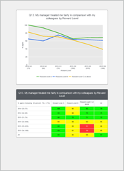 For surveys over multiple time periods, this report shows the trend of each rating and number question split out by [Main demographic] as a chart and table.