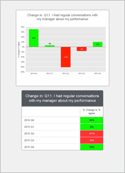 For surveys over multiple time periods, this report shows the change of each rating and number question from one period to the next as a chart and table.